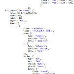 이번에는 ExtJS 5.1 에서 추가된 훌륭하고 스펙타클(?) 한 기능인 3D 차트 중 하나인 3D 세로형 막대그래프를 한번 출력해보도록 하겠습니다. 3d 그래프의 경우 내부적인 요소는 기존에 출력되는 그래프의 요소와 동일하고 type에 대한 설정부분만 변경해주면 되는것 같습니다.이전 강좌인 코드에서 type 부분만을 변경하고 동일한 화면과 기능을 이용하겠습니다. 기본 3D 세로형 막대그래프 이전 코드에서 다루었던 첫번째 코드를 보겠습니다. ▼ 코드가 작성 되었는데, 상단 코드에서 딱! 3가지만 변경을 하면 아름다운 3D 그래프를 출력할 수 있습니다.그게 무엇이나하면..... axes 내에 정의되어있는 type config 와 series 내에 정의되어있는 type config 입니다.변경은 아래와 같습..